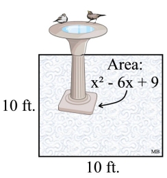 A birdbath is to be placed on a concrete slab measuring 10 ft. by 10 ft. The area of the square base of the birdbath is represented by x2 - 6x + 9.