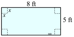 Squares with side lengths of x feet are cut out of the 4 corners of a rectangular piece of plastic (as shown), which is then folded up to form an open-top box. Express the volume of the box in completely factored form (in cubic feet).
