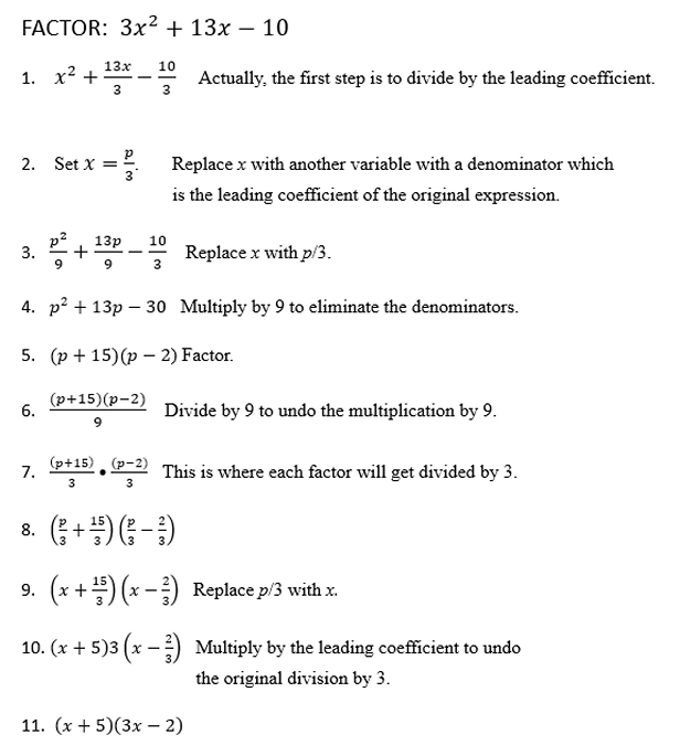 Rationale for factoring 3x2 + 13x - 10 by "Slide and Divide" Method. |