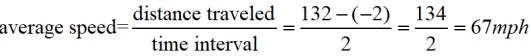 A car's starting position on a number line (representing "miles"), is located at -2. At the end of a trip, the car's position is at 132 on the number line. The trip takes 2 hours.
