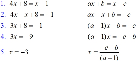 Let's compare an equation that we are familiar with solving, (4x + 8 = x - 1),