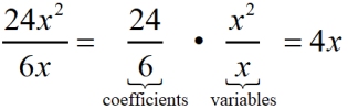 NOTE: In Algebra 1, "division of polynomials" is not addressed as an in-depth topic. Polynomial division has, however, already been seen when dealing with topics such as ratios, algebraic expressions, rules of exponents, and factoring. (Keep in mind that the fraction bar symbolizes division.) On this page we will take a look at some familiar problems, as seen through the lens of division. (None of the examples allow division by zero.)