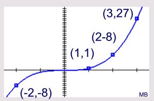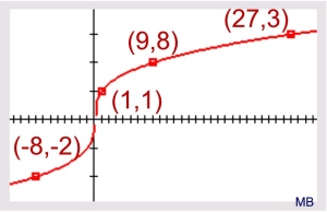 Notice that the columns of values have "switched places" between the cubic function (on the left), and the cube root function (on the right). The x and y values have "swapped" positions. Remember, "cubing" and "cube rooting" are inverse operations. |