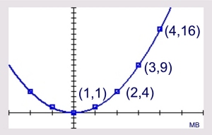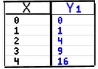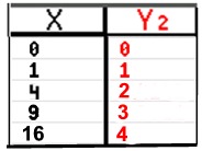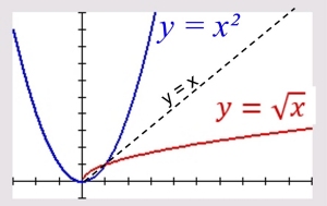 Notice that the columns of values have "switched places" between the quadratic function (on the left), and the square root function (on the right). The x and y values have "swapped" positions. Remember, "squaring" and "square rooting" are inverse operations. |