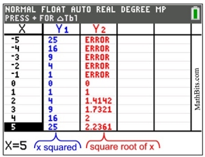 When we graph both functions, and examine the graphs in a table, we can see that the calculator understands that the square root function cannot deal with x-values that are negative (x < 0).